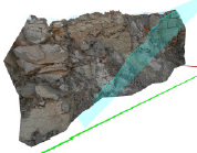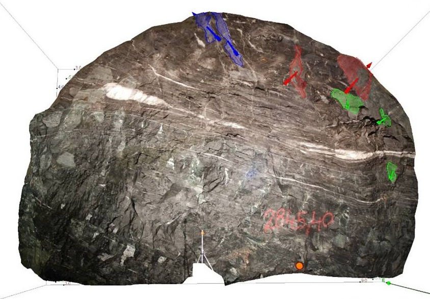 Figure 2: 3D image of 15 m wall taken in an open pit together with measured discontinuity orientations as