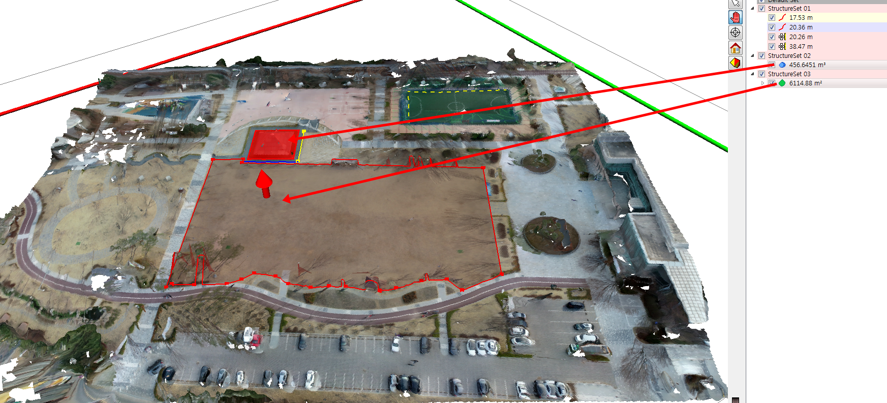 각도, 전리면, 거리, 면적, 등을 분석하는 편리한 사진측량